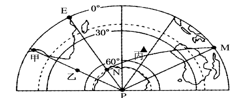4、单选题 下图是以极点为中心的东半球图,MN为晨线,N为晨线与极圈的切点。读图完成下列各题。