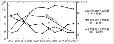 2.根据老年劳动力人口比重持续上升,反映人口老龄化严重。