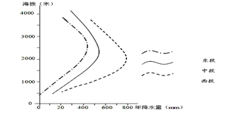 1.该山地可能是2.导致该山地最大降水高度东西变化的原因主要是 A.秦岭 B.天山山脉 C.南岭 D.祁连山脉 E.从东向西水汽增加 F.从西向东温度降低 G.从东向西海拔降低 H.从西向东风力增大