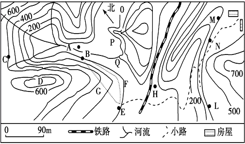 (1)读图中等高线可知,D处等高线高于600米,且等高距为100米,故D处山地地形海拔高于700米;E处海拔高度为100米,M处海拔高度为400米,故EM两地相对高度为300米。