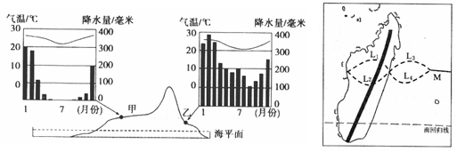 【小题2】乙地位于马达加斯加岛的东侧,为热带雨林气候,其成因为位于东南信风的迎风坡,降水量丰富,且受沿岸暖流影响。