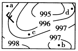 小题1:下列关于四地天气叙述中,发生概率最小的是(?) A.a地气温为四地最低 B.b地天气晴朗少云 C.c地将出现阴天下雨刮风降温天气 D.d地正经历连续性降水天气