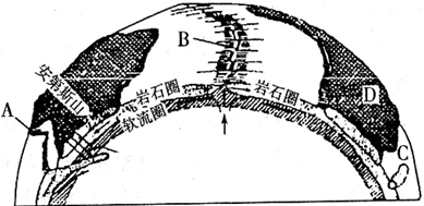 1.图中剖面可能经过六大板块中的2.关于图中 A、B、C、D 四处地理事物的描述,正确的是