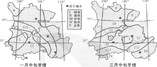 小题1:从图中可以看出进入2010年以来,在我国图示地区干旱范围不断扩大,重旱区逐步从云南省扩展到四川省的南部、贵州省全部和广西省西北部等。
