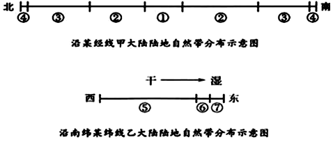 【小题2】根据乙大陆东部湿润,西部干旱可知,且位于南半球可知,该大陆为澳大利亚大陆;由上题可知,甲大陆为非洲大陆。图中①为热带雨林,②为热带草原,③为热带荒漠,④为亚热带常绿硬叶林,⑤为热带沙漠,⑥为热带草原,⑦为热带雨林,故图中①与⑦相同,②与⑥相同,③与⑤相同。