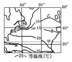 (3)与大洋西岸等温线相比,大洋东岸等温线在甲处海域向 (南、北)凸出,主要是甲处受 (洋流)的影响,乙处等温线向 (南、北)凸出,是因为乙处受 (洋流)的影响。