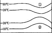 【小题1】解答此题需明确等温线弯曲方向与温度高低的关系。由于暖流水温比所经海区水温高,因此在同一纬度线上,暖流水温比两侧水温高,等温线必然向高纬方向凸出;寒流经过的海区,等温线必然向低纬凸出。反之,凡是海水等温线向高纬凸出的,则可能有暖流流过;海水等温线向低纬凸出的,则可能有寒流经过。由此可得出如下结论:海水等温线的凸出方向便是洋流流动的方向,由水温高处流向水温低处的洋流为暖流,由水温低处流向水温高处的洋流为寒流,即凸低温为暖流,凸高温为寒流。图中①②两处均向高温区凸出,因此都是寒流。