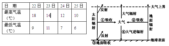 【小题2】23日最低气温高,说明大气保温作用强,夜晚多云,大气逆辐射强,A正确;②为大气吸收地面辐射,吸收作用强,B错;C.D与保温作用无关。