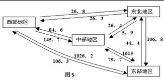 A.城市经济发展缓慢,就业压力大 B.城市规模不断扩大,大量企业迁往远郊,造成上下班交通堵塞 C.传统工业发展迅猛,人均绿地面积不断减小 D.人口密度与就业密度的变化不一致,造成上下班交通严重拥挤 4、单选题 近年来,随着我国内地的企业不断增加,原在沿海工作的务工人员出现大量返乡就业的现象。这种现象总体上不利于 5、单选题 读我国四大地区人口流动示意图5,回答问题。 |