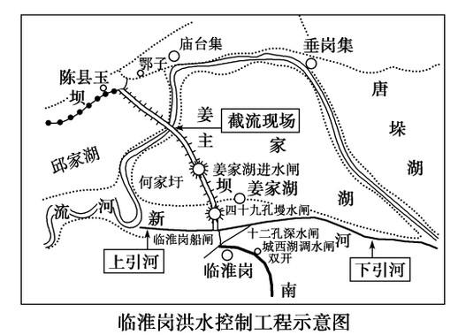 材料一:2010年11月6日治理淮河的标志性工程——临淮岗洪水控制工程正式建成,标志着淮河干流结束无控制性枢纽的历史。该工程主体位于安徽省境内淮河干流中游,涉及安徽、河南两省,其防洪范围包括淮北广大地区和蚌埠、淮南等沿淮城市。工程建成后,使淮河中游防洪标准提高到百年一遇。该工程上游山区水库、中游蓄洪区、下游淮北大堤共同构成淮河综合防洪体系。