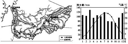 材料二?田纳西河流域示意图及流域内的诺克斯维尔市年内各月气温和降水量图。
