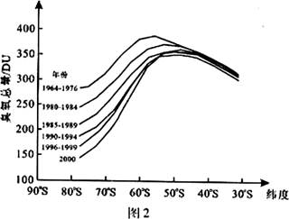 5、单选题 臭氧层保护是当今全球最重要的环保议题之一。图2反映了9月份30°S~80°S平流层臭氧总量多年变化状况。读图2回答第1-2题。