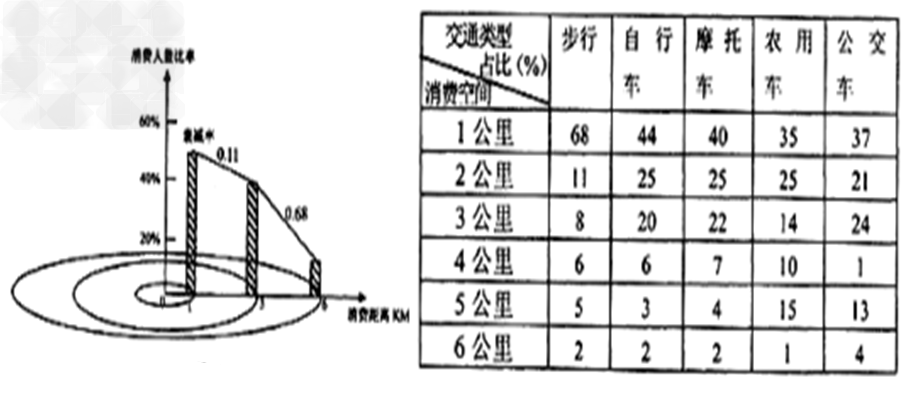 3、多选题 农户消费空间是乡村空间结构的一种表现,摸清农户的消费空间结构意愿对于新农村规划建设和村镇布局调整具有重要参考价值。下图是我国某区农户消费活动空间结构模式图,下表为该区农户使用不同交通工具的消费空间分布。分析回答1~2题。