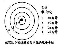 2、单选题 ? 文化设施的服务半径是指各项设施所服务的空间距离或时间距离。文化设施的分级与服务半径的确定应考虑两方面的因素:一是居民的使用频率,二是设施的规模效益。以学校为例,中学属于城市级和居住区级项目,其服务半径可控制在1000米之内。小学属于综合小区级项目,相邻社区的学生以不跨越城市干道为宜,服务半径控制在500米以内。读图及所给材料回答(1)——(2)题。