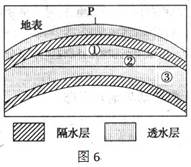 5、单选题 图6的背斜中,储存有石油、天然气资源,从P点向下钻井,当钻头位于①、②、③“层”时,可能分别探测到