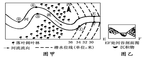 4、单选题 图甲为大陆东岸的某河段示意图,图乙为图甲中EF处的河床横剖面图。