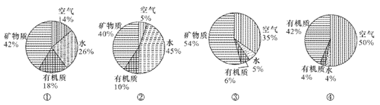 小题2:水稻种植业对水的需求量大,土壤中水分占的比例大,③、④空气比例大,C、D错。①中有机质含量超过了理想值,水分占的比例与空气差不多,A错。②图中水分占比例明显较多,孔隙比例也适当,适合水稻生长,B对。