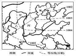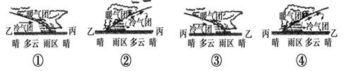 【小题2】若M线是锋线,结合前面分析,M线位于气旋的左边部分,应是锋面气旋的冷锋部分。北半球的气旋是逆时针旋转,所以乙位于冷锋的冷气团一侧,丙位于暖气团一侧,冷锋中的冷气团推动暖气团移动,与图对照,只有①符合,A对。B、C、D错。