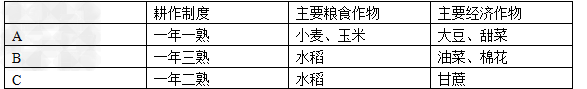 2、综合题 图中A、B、C三地为我国重要的商品粮基地,比较A、B、C三地差异,填写下表。