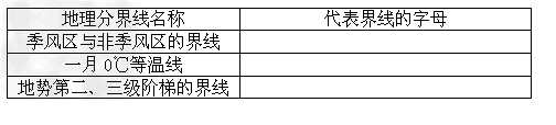 (1)将我国重要地理分界线的代表字母,填入表中相应界线名称后的空白栏内。