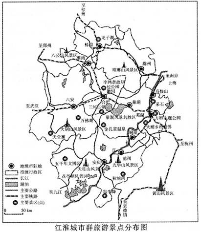 (1)据图说明该区域旅游资源的分布特点。(6分)