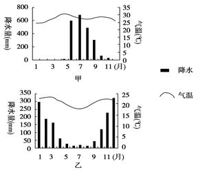 (2)甲、乙、丙、丁四条河流中,径流量最大的是__________河,试从气候角度说明原因。(6分)