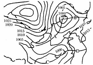 (2)在A、B两条锋线中,A代表___锋(冷或暖),B代表___锋(冷或暖)。这两条锋线与该处的低压中心合为一个大的天气系统,称为_________。(6分)