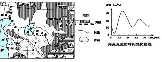(2)读右图,阐述甲地在图示时间内河流流量变化的特点,并从天气角度分析原因。(10分)