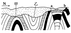 (1)读图,根据岩层弯曲的形态判断,图示地质构造类型甲处岩层向上拱起,是背斜构造 ,乙处岩层向下凹,是向斜构造,a、b岩层发生措动位移,属于断层。