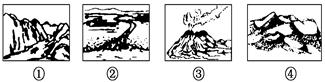 小题1:图示1处为背斜,有良好的储油结构;2处为火山喷发,可能形成喷出岩,而石灰岩属于沉积岩;3处为向斜结构,向斜储水,图示4处地势较低,可能形成沉积岩,沉积岩中可能形成化石,故选D项。
