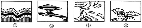 图中①为褶皱,是地球内力作用的结果;②为风蚀蘑菇,是风力侵蚀的结果;③为三角洲,是流水沉积的结果;④为断层,为地球内力作用的结果。答案选A。