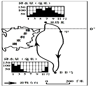 小题1:维多利亚湖附近虽在赤道附近,但由于地形的抬升却形成了热带草原气候,热带草原气候有明显的干湿两季,这才有了迁移的路线。根据气压带和风带的移动规律,夏季北迁,冬季南迁。该区域为热带草原气候区,故B项错误。