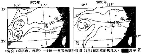 【小题1】先正确理解夏玉米播种日期等值线的含义,数值越大,表明夏玉米播种日期越迟。仔细读图,不难发现与1970年相比, 2000年夏玉米播种日期推迟的是③。1970年③地夏玉米播种日期在1月1日以后130~140天,到2000年为140~150天。故C正确。
