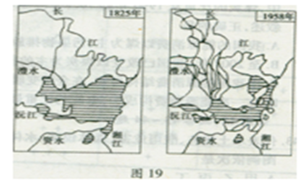 5、综合题 (14分)阅读材料,回答问题。材料一:我国平均每年有20个天然湖泊消亡,统计表明,20世纪50年代湖北省共有湖泊1052个,有“千湖之省”的美誉,而今只剩下83个。我国西部一批烟波浩淼的大湖相继消亡。湖泊逐渐向盐湖、干盐湖方向发展。材料二:到1958年洞庭湖面积能变化示意图(图19,阴影部分为洞庭湖)。(1)分析洞庭湖迅速萎缩的主要人为原因。(2)湖泊萎缩、消亡对环境的影响重大,根据所学知识对此作出简要阐述。(3)我国西部地区盐湖、干盐湖逐年增多,其主要自然原因是什么?
