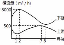 小题1:该河流位于北半球,1,2月为冬季,7、8月为夏季。1、2月流量大不可能是冰川融水补给,只能是雨水补给,所以下游是雨水补给;7、8月上游流量大,而下游流量为全年最低,上游应是获得冰川融水补给,下游水量与上游比没有多少增加。故选D。