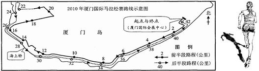 5、单选题 经国家体育总局批准,2010年厦门(北纬24°27′,东经118°06′)国际马拉松赛事于北京时间1月2日上午8点鸣枪开赛。下图为2010年厦门国际马拉松赛路线示意图和某女运动员比赛过程即时素描图。当该女运动员到达全程赛事终点时,她的身影向正北并大致与身高相等。结合下图回答下列各题。