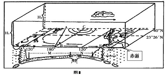 4、综合题 读地理景观模式示意图(图8),AB表示昏线,B点经度为1800?,H1和H2分别代表当地对流层的高度,此时南极圈以内全部出现极昼现象。回答下列问题