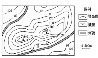 【小题2】读图可知图示地区最高海拔小于240米,是由两座山丘组成的丘陵地形,地势起伏和缓;河流流经地区地势平缓水流流速较平缓;陡崖的相对高度在80-160米之间,故A正确。