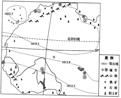 【小题1】从图中等压线数值和形状可以看出,图示区域北部气压较高,该地位于北纬30°附近,该高压为副热带高压带,和平均位置相比,副热带高压带的位置较为偏南,说明为北半球冬季,蒙古高压最强。