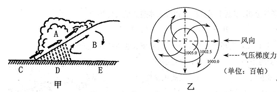 (3)根据图示:图中乙越往中心气压越高,所以乙图中F处是高气压中心,根据气流顺时针从中心向四周辐散,所以位于北半球,高压控制,天气晴。