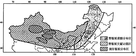 ④目前主要分布在陕西和内蒙古交界地区2.与遗骸分布区、文献分布区相比较,目前的野骆驼分布区3.影响野骆驼分布区变化的因素包括