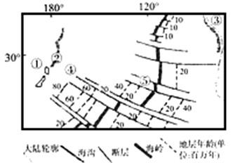 (4)关于下图中板块分布及其运动的叙述、正确的是______________(填选项) A、图示区域范围内涉及4大板块B、①②之间发生地震的概率高于②④之间C、板块挤压处⑤的地层年龄较轻D、③附近海域冈板块碰撞形成岛弧链