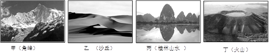 【小题1】读图可知,图中甲为角峰,故为冰川作用;乙为沙丘地貌,故为风力作用;丙为流水侵蚀作用;丁为火山,为内力作用。