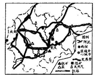 本题解析: (1)直观看出区域中心城市、煤矿、天然气等经济点都沿河流和铁路、公路线分布。 (2)本题可以从自然地理条件和社会经济条件分析。自然条件:资源丰富;社会经济条件:交通、劳动力、市场、国家政策等分析。 (3)高新技术产业的区位因素:靠近科研院校;人才密集;国家政策支持;环境优美;劳动力素质高;交通便利。结合成都的实际发展特点和高新技术产业的区位因素进行作答。