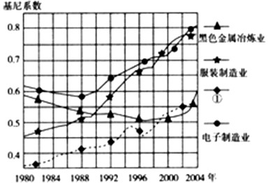 1、单选题 下图是我国不同产业空间集中程度及其变化趋势统计图(基尼系数越高,表明空间集中程度或专业化程度越高),读图回答1~2题。