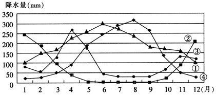 1、下图中①②③④四条降水量的月份变化曲线,与图中甲地相符的是