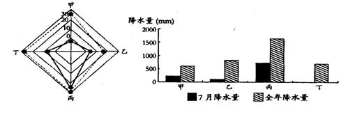 本题解析:本题主要考查气候分析。根据实线、虚线分别表示的1月和7月均温及降水量的分布,判断甲为温带季风气候;乙为温带海洋性气候;丙为热带季风(或草原)气候;丁为地中海气候。