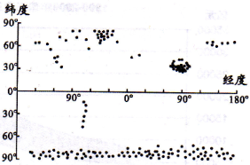 5、单选题  该图中黑点表示某资源的主要分布区。读图回答下面2题。