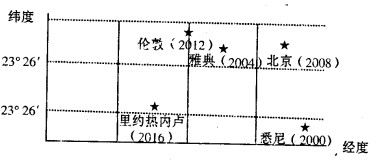 1、单选题 第30届夏季奥运会于2012年7月27日19点12分(零时区区时)在伦敦开幕。结合右面“21世纪初奥运会承办城市分布图”,回答下列问题。