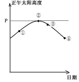 小题1:甲地某日日出时间为7:20(北京时间),白昼长14小时,正午太阳高度的年变化如图所示(P<90°),甲地的位置可能为